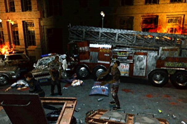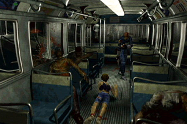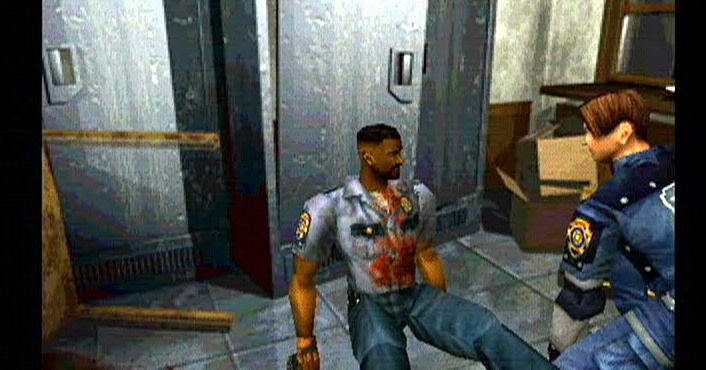 Nel frattempo, Leon Scott Kennedy (un neo poliziotto) si ferma in mezzo alla strada perché trova un cadavere, ma ad un certo punto si accorge di essere stato circondato dagli zombi e così indietreggia in un vicolo sparando loro contro e rimanendo sbalordito della loro resistenza. Claire, aperta la porta di emergenza, incontra Leon, che dopo averla vista, le dice di abbassarsi e spara allo zombi che ormai le era quasi addosso. Così si uniscono e dopo aver preso un'auto da pattuglia si recano alla stazione di polizia. Mentre avviene tutto questo, in una stazione di servizio, un camionista viene morso da uno zombi e mentre è alla guida del proprio pesante mezzo, si trasforma in uno zombi a sua volta.